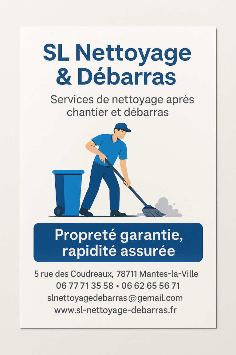 SL Nettoyage & Débarras est une entreprise spécialisée dans le nettoyage après chantier, le débarras de maisons et locaux, et la désinfection rapide. Nous intervenons 7j/7 partout en Île-de-France pour offrir un service professionnel, réactif et efficace. Propreté garantie, devis gratuit, intervention rapide.